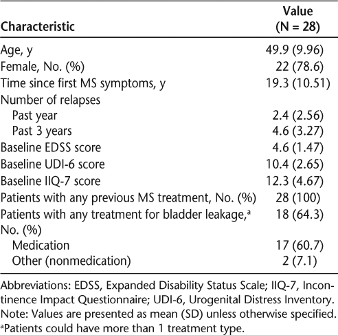 Baseline demographics and clinical characteristics of the 28 patients who completed the study are shown in Table 1. Seventeen patients were taking medication for bladder symptoms at study entry and continued their baseline dosage throughout the study. Bladder medications used by study participants included darifenacin, desmopressin, doxazosin, oxybutynin, solifenacin, tamsulosin, and trospium.