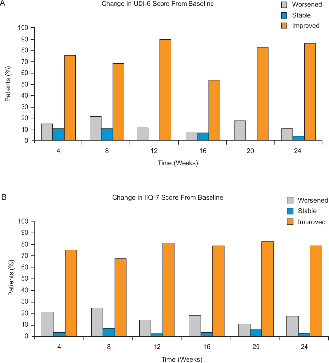 The changes in UDI-6 score from baseline were also analyzed using a more rigorous definition as follows: improvement: score decreased by at least 3 points; stable: score unchanged or decreased by less than 3 points; worsened: score increased from baseline (>0 point). With the use of these criteria, there were significant differences in the proportions of improved, stable, and worsened patients at 12, 16, 20, and 24 weeks. At week 12, 56%, 33%, and 11% of patients showed score improvement, stability, and worsening, respectively (P < .01). These proportions remained relatively stable for the remainder of the study; at week 24, 64%, 25%, and 11% of patients showed score improvement, stability, and worsening, respectively (P < .01).