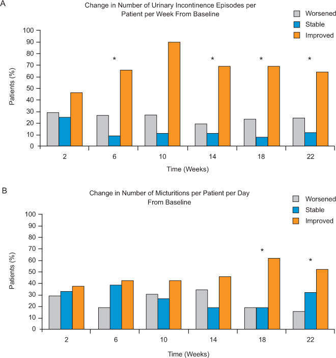 Change from baseline to week 22 in the proportion of patients with worsened, stable, or improved (A) number of urinary incontinence episodes per patient per week, and (B) number of micturitions per patient per day
