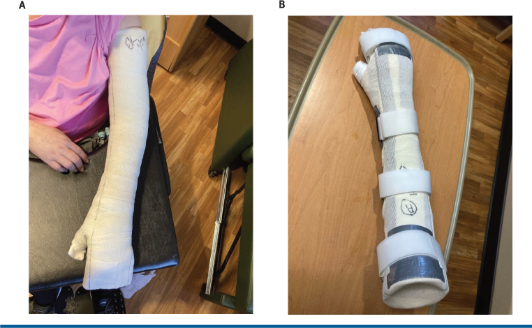 The first cast was applied during visit 10 on Monday of week 13 and removed during visit 11 on Thursday of the same week. A new cast was immediately applied after removal of the first cast. The second cast was removed and turned into a bivalve splint during visit 12 on Wednesday of week 14. The cast was turned into a bivalve splint by cutting it in half and modifying it with padding and strapping to allow it to be removed and reapplied with the goal of maintaining the gains in ROM. The participant wore the bivalve at home briefly (ie, 30-60 minutes) to assess skin integrity, and then was instructed to wear it while sleeping each night.