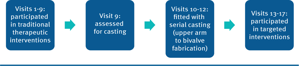 It was determined that RUE spasticity was a barrier to RUE function. Consequently, the participant was assessed for appropriateness of serial casting in visit 9, and it was determined that long-arm serial casting (LASC) with bivalve fabrication and targeted therapeutic interventions following LASC could potentially be beneficial for the RUE (Figure 1). The overarching goals of LASC were to decrease spasticity, prevent a contracture from forming at the elbow joint, and increase functional use of the participant’s RUE.