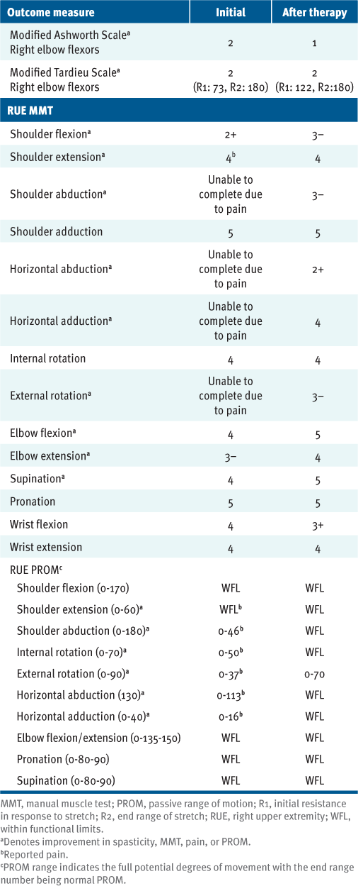Spasticity, muscle strength, PROM, pain, and functional use of the participant’s RUE were assessed throughout the POC to determine her response to treatment and the appropriate next steps. The Modified Ashworth Scale (MAS) was used to measure spasticity of the right elbow flexors and was completed during visits 9 through 13 and again on visit 17.9 In addition, the Modified Tardieu Scale (MTS) was used to measure spasticity of the right elbow flexors at slow and fast speeds, which included the initial resistance in response to a stretch (R1) and then the end range of the stretch (R2).10 The MTS was completed 6 times (ie, visits 8, 10, 11, 12, 13, and 17).