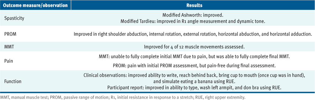 Interpretations of outcomes were based on changes in spasticity, which may have impacted strength, PROM, pain, and functional use of the RUE. Statistical analysis was not completed due to this being a single-participant case report.
