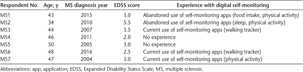 In-depth interviews were conducted with seven adults with MS before and after participation in a study in which they used an activity tracker and an MS-specific smartphone app for 4 weeks. We inquired about experiences with the tools in daily life and needs and wishes regarding further development and implementation of digital self-monitoring for people with MS.