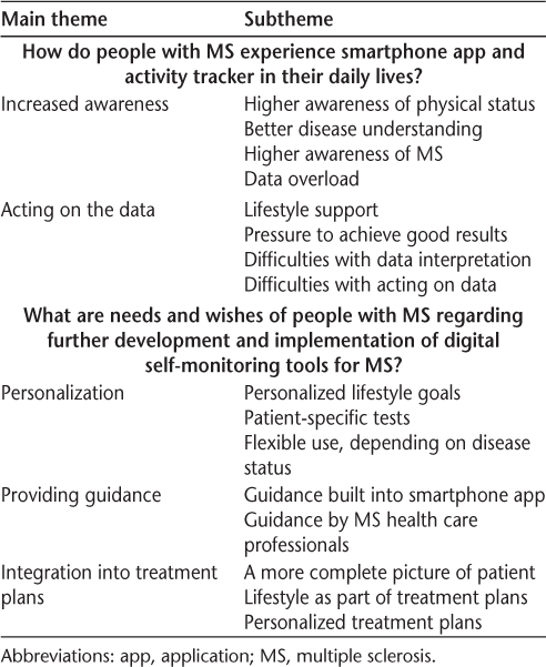 Furthermore, some remarks are required regarding the study design. First, the interviews were conducted by telephone rather than face-to-face. We are aware that the absence of visual cues can affect the interpretation of responses, as certain contextual and nonverbal data are missing. However, data from telephonic interviews are not necessarily lower in quality than data from face-to-face interviews.30 Second, the current interviews explored the experiences of people with MS who had been using a smartphone app and an activity tracker for a relatively short period of 4 weeks. Therefore, we gained insight into short-term experiences only, whereas experiences might well change when these tools are used for a longer period. Third, the perceptions of the respondents might have been affected by the fact that they used digital self-monitoring in the first place to generate data for validation of the smartphone app and the activity tracker and not with the explicit aim to engage in monitoring of their own health. Finally, we acknowledge that the experiences of the respondents might have been influenced by the specific form of digital self-monitoring that has been used in the MS Self study, through a smartphone app and an activity tracker. This form of self-monitoring consisted of continuous (activity tracker) and high frequency (smartphone app) monitoring, whereas experiences might be different when the self-monitoring measurements are less frequent.