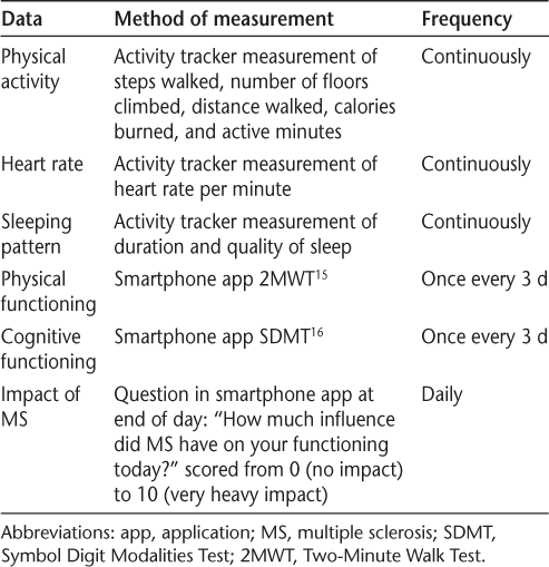 The MS Self study was approved by the medical-ethical committee METC Brabant (Tilburg, the Netherlands). Participants had to use a Fitbit Charge 2 (Fitbit Inc, San Francisco, CA) activity tracker and the Mijn Kwik (MS sherpa BV, Nijmegen, the Netherlands) smartphone app for 4 weeks (Figure 1). The Mijn Kwik app is the precursor of the MS Sherpa app (MS sherpa BV) and was made available only for research purposes.13 An overview of the data collected through the activity tracker and smartphone app is presented in Table 1.