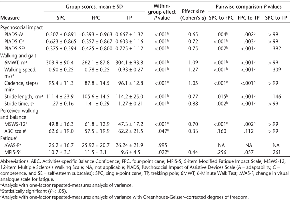 There were significant main effects of assistive device on 6MWT distance, walking speed, cadence, stride length, stride time, and MSWS-12 and ABC scale scores. Pairwise comparisons showed that these measurements were better with the SPC and the TP than with the FPC in all measures except for the ABC scale, where the effect did not persist in planned comparisons.