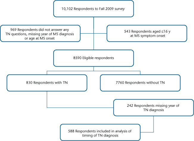 For this analysis, we excluded individuals who did not answer the question regarding whether they had a diagnosis of TN or who indicated a response of unsure. To limit heterogeneity due to potential differences in adult-onset and pediatric-onset MS, we excluded those with an age at MS symptom onset of 16 years or younger. Analyses of the timing of TN diagnosis were limited to participants with TN who reported the year of diagnosis.