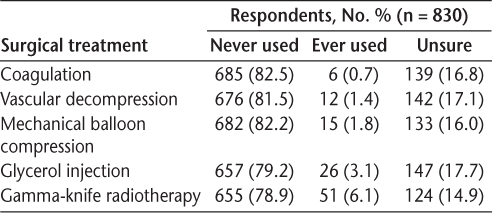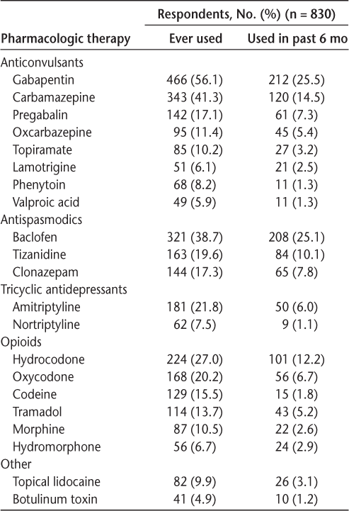 As expected, use of pharmacologic treatments for TN was common, with 733 respondents (88.3%) reporting that they had ever used one of the therapies queried. The class of medications that was most commonly ever used was anticonvulsants (655 [78.9%]), followed by antispasmodics (422 [50.8%]) and opioids (306 [36.9%]). The most commonly used medication was gabapentin, followed by carbamazepine (Table 4). Nearly 65% of respondents had used one or more pharmacologic therapies in the past 6 months (n = 537). Of these, 230 (42.8%) used one, 147 (27.4%) used two, 93 (17.3%) used three, and 67 (12.5%) used four or more of these pharmacologic therapies. With respect to procedures, 81 respondents (9.7%) had ever undergone at least one procedure to treat their TN. The most common procedure reported was gamma-knife radiotherapy, followed by glycerol injections (Table 5).