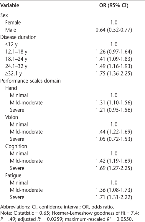 On multivariable logistic regression analysis, several characteristics were independently associated with increased odds of reporting a diagnosis of TN, including longer disease duration and greater impairment in the domains of hand function, vision, cognition, and fatigue (Table 2). Male sex was associated with decreased odds of reporting TN.