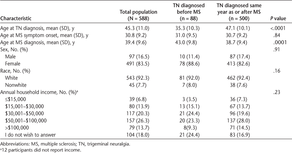 We summarized the demographic and clinical characteristics of participants using means, standard deviations (SDs), medians, interquartile ranges, frequencies, and percentages, as appropriate. We report the proportion of participants with a diagnosis of TN and when this diagnosis occurred in relation to the diagnosis of MS. We also report the frequency with which specific treatments for TN were used. Student t, Wilcoxon, and χ2 tests were used to compare the demographic characteristics of participants with and without a diagnosis of TN and those of participants with a diagnosis of TN before or after MS diagnosis.
