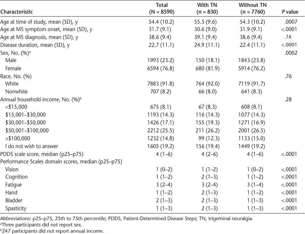Of those who responded, 8590 were included in the analysis (Figure 1). Most participants were female and white, with a mean ± SD age at MS onset of 31.7 ± 9.1 years (Table 1). Nearly 10% of participants (830 of 8590) reported a diagnosis of TN. On univariate analysis, compared with participants without TN, those with TN were more likely to be female, to have an earlier age at symptom onset and a longer disease duration, and to experience greater disability in all the domains assessed (Table 1). Race, annual income, and age at MS diagnosis did not differ between groups.