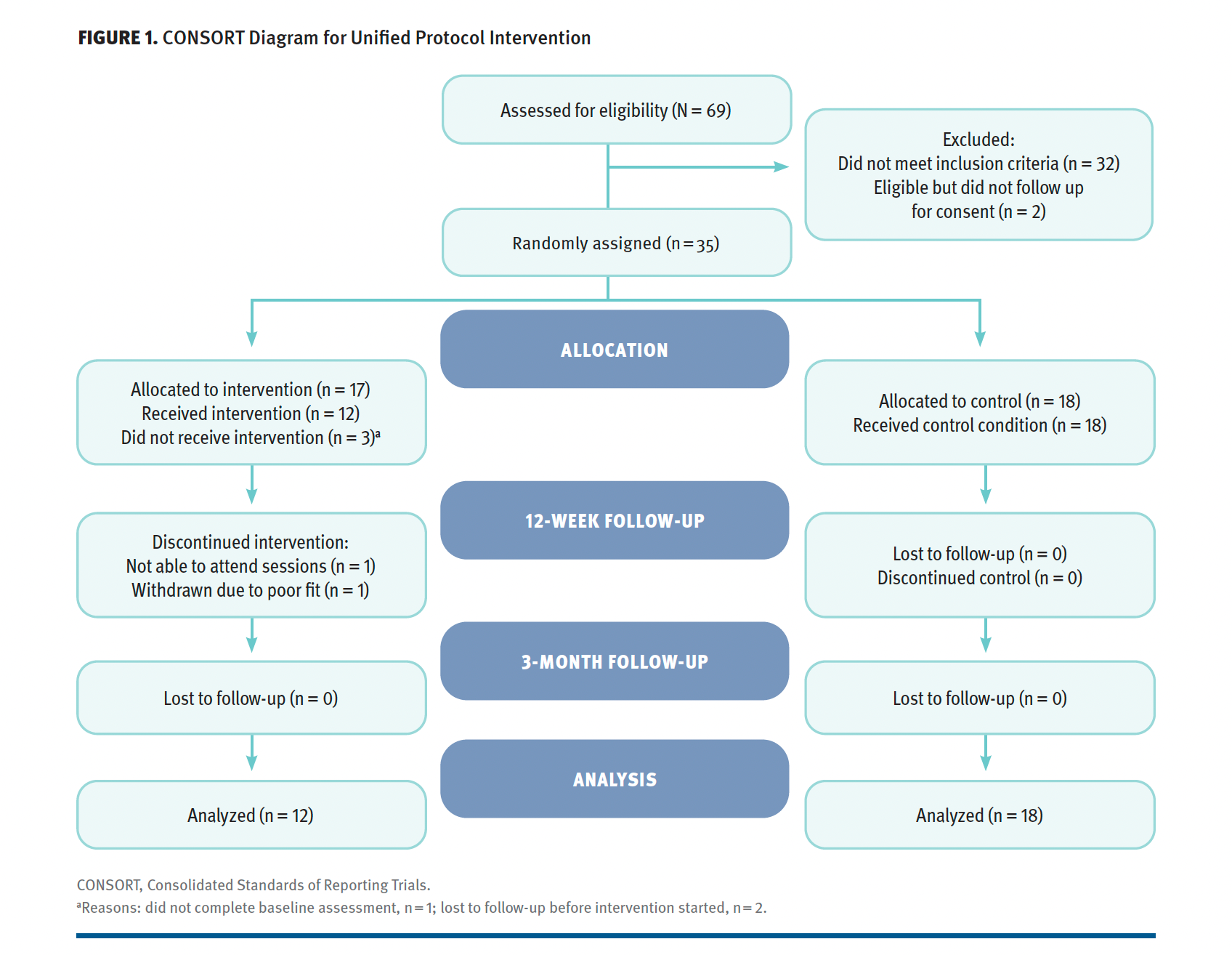Participants underwent screening for depression and anxiety. Inclusion criteria consisted of significant depression on the Beck Depression Inventory-Second Edition (cutoff score of 20 or higher)37 and/or anxiety on the State-Trait Anxiety Inventory (cutoff of 1.25 SD above normative means),38 a definitive diagnosis of MS, 18 years and older, English speaker, ability to provide informed consent, and access to the internet. The exclusion criteria were a history of any other neurological illness, current participation in another RCT, cognitive impairment that would affect the ability to fully participate in the group, inability to attend group sessions, and active participation in another formal clinical group or psychological therapy. Given the large effects previously found with the UP, a power analysis suggested that a sample size of 20 would be sufficient in order to obtain a power of 80% when utilizing a repeated-measures analysis of variance (ANOVA). It has also been suggested that a general rule of thumb for a pilot RCT is 12 participants per arm.39 Given this, we sought a sample of 24. A total of 69 individuals were screened for the study, and 35 met the inclusion criteria (Figure 1).
