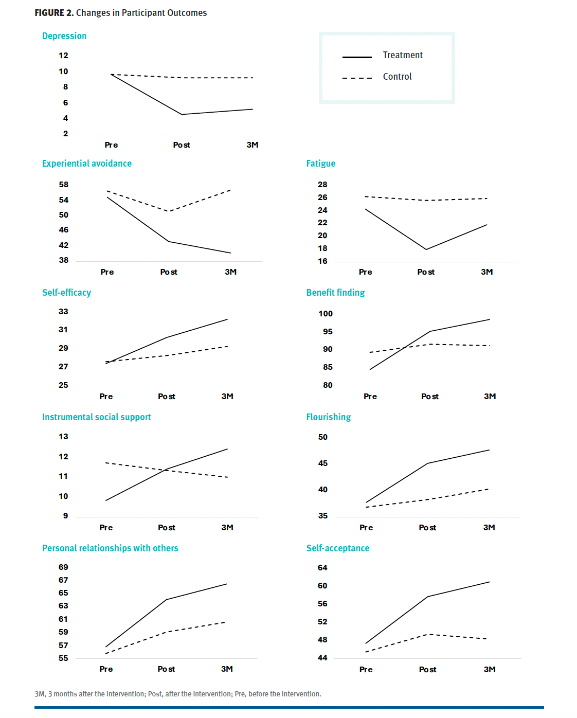 The treatment group experienced significant reductions in depression and experiential avoidance immediately following the 12-week intervention and at the 3-month follow-up. Significant reductions in fatigue and improvements in general self-efficacy, environmental mastery, coping (ie, benefit finding and instrumental social support), QOL (ie, flourishing), and psychological well-being (PWB; ie, positive relationships with others and self-acceptance) were also observed (Table S1, Figure 2; supplemental materials are available at the end of the online article as a PDF). No significant effects were found for anxiety, positive or negative affect, sleep disturbance, pain, or MS self-efficacy.