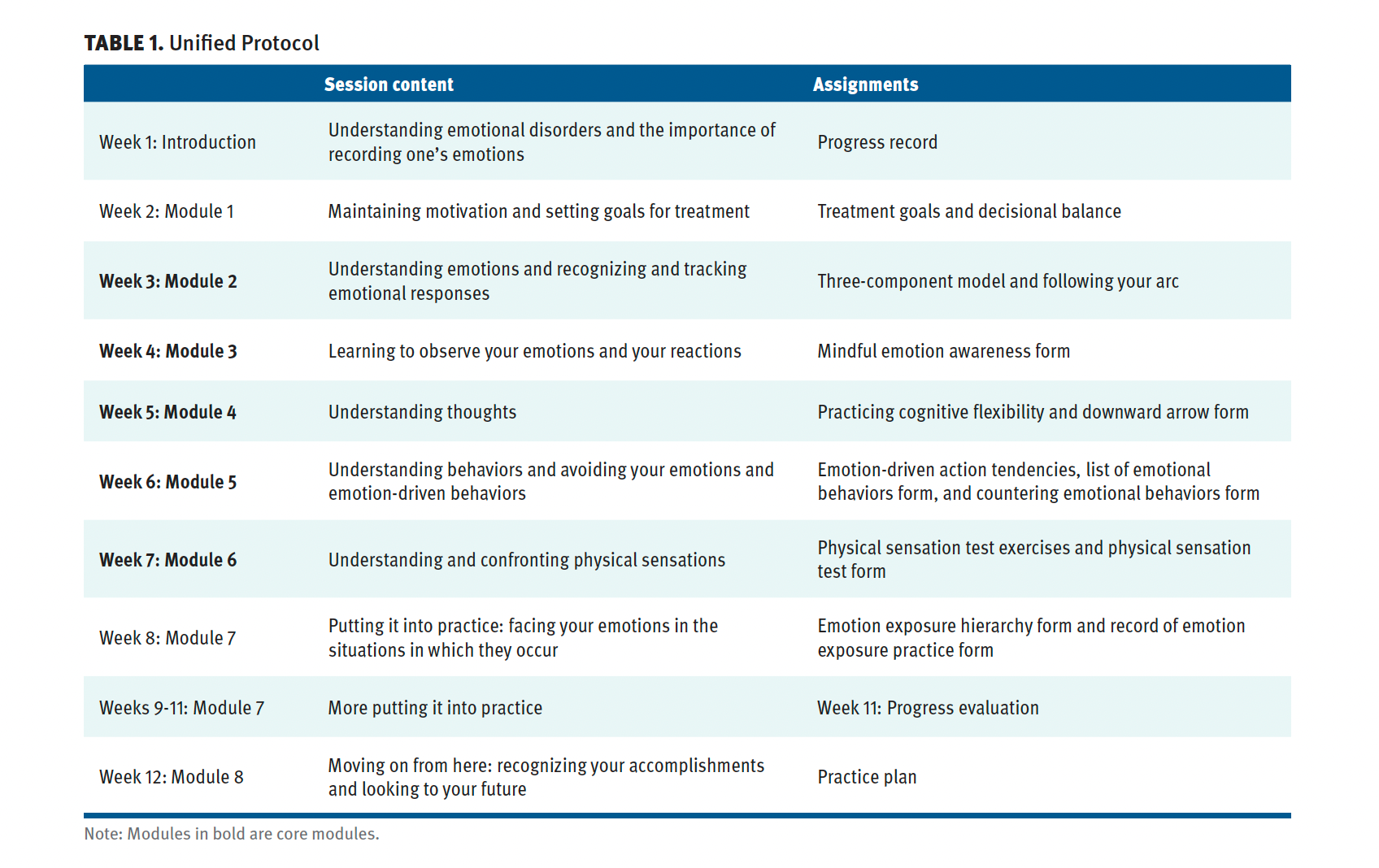 The UP is a contemporary CBT transdiagnostic treatment that targets the shared temperamental core of psychological disorders and is meant to help anyone struggling with managing their emotions, regardless of diagnosis.22 The focus on shared etiology and maintenance features is informed by advancements in psychopathology and emotion science23-25 and stands in slight contrast to traditional CBT protocols that tend to focus on a single domain or manifest symptoms.26 The intervention can be conducted individually or in a group,27,28 typically over 12 weeks. It consists of 8 modules, of which 5 core modules address the fundamental components of CBT aimed at identifying one’s emotional experiences and adverse reactions to them, namely thoughts, feelings (physical sensations), and behaviors. Two introductory sessions are aimed at understanding and tracking participants’ emotions, reviewing participants’ symptoms and how they interfere with daily life, providing a treatment rationale, enhancing motivation, and setting goals. From this, core modules are provided in sequential order. Following this, participants are encouraged to put what they have learned into practice and face their emotions while tracking their experiences in more objective ways. Finally, the last module consists of relapse prevention.29