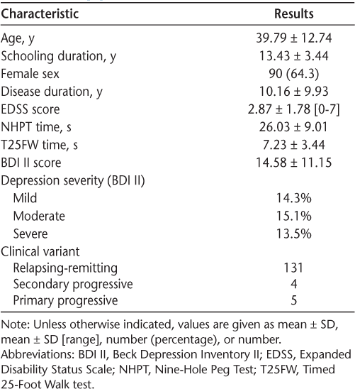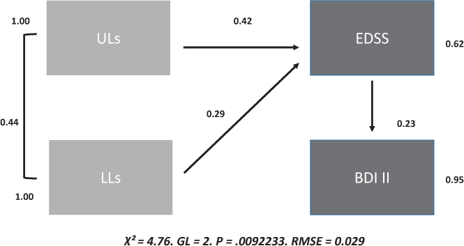 A structural equation model with observed variables was also used to analyze the relation that upper limb dexterity, lower limb speed, and EDSS score have with depression. Spearman correlations were used to assess the association of these variables with HRQOL measurements. Said evaluation comprised a sample of 52 patients, and the normality assumptions of these subpopulations were not met by all the variables. Finally, linear multiple regression was used for the analysis of the possible role of upper limb dexterity, lower limb speed, and the EDSS score as predictors of individual HRQOL measurements. Statistical analysis was performed using SPSS Statistics for Windows, version 20 (IBM Corp) and structural equation modeling with LISREL software, version 9.3 (Scientific Software International).