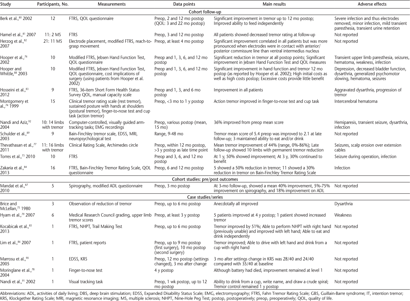 In October 2014, we searched Web of Science, PubMed, MEDLINE (Ovid), and MS-related journals that were not included in the databases. For the initial search, a qualified librarian helped provide the most effective search strategy. The search terms were tremor, intention tremor, action tremor, and multiple sclerosis. Two reviewers (J.K.M. and J.A.R.) independently performed the search using the same search strategy. The independent search results were then merged, and duplicates were removed. The inclusion criteria were English-language articles, non–conference proceedings, research articles, human studies, and articles that included MS-related intention or action tremor. The two reviewers independently applied the inclusion criteria to article titles and then to abstracts, and any disagreements or questionable articles were resolved and decided on by discussion. Standardized data extraction tables created a priori by the senior author (S.J.F.) were completed by both reviewers. Four tables were created summarizing literature related to noninvasive interventions, pharmacology, thalamotomy, and deep brain stimulation (DBS). Data collected on interventions included study design, intervention type, sample size, measurements, main results, and mechanisms of action, as well as adverse effects for pharmacologic and surgical interventions (Tables 1–4).