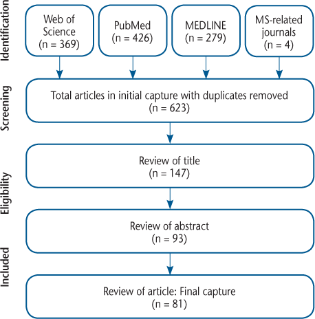 The initial search in each database yielded the following results: Web of Science (n = 369), PubMed (n = 426), MEDLINE (Ovid) (n = 279), and additional MS-related journals (n = 4). After removing duplicates, the initial search yielded 623 articles. After applying the inclusion criteria, a final capture of 81 articles8,9,12,14–71,73–92 was used for data extraction (Figure 1).