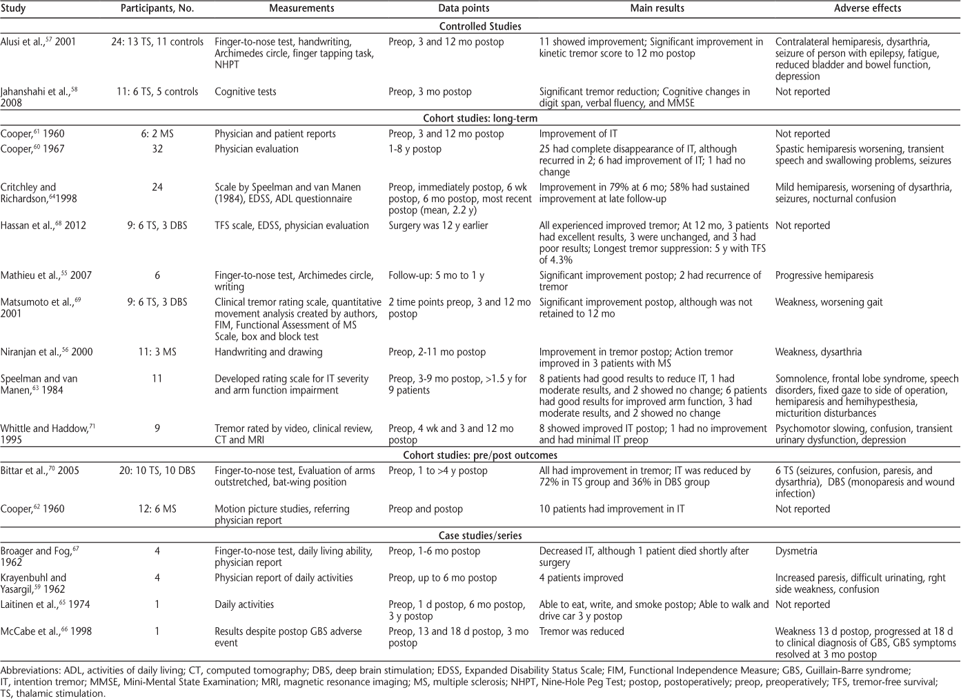 Thalamotomy is a process by which an area of the thalamus is ablated by various methods. There were 17 articles that fell under the category of thalamotomy as their main intervention (Table 3). Two of the studies55,56 used a radiofrequency method, which limits the invasiveness of the surgery. Thalamotomy was generally effective in most groups, although some patients experienced a relapse of tremor often 1 year or more after surgery. Two articles in the search included control groups,57,58 although one of the articles was retrospective and included information from patients in the first study. Some studies were older and included only physicians' descriptions as outcomes.59–62 Speelman and van Manen63 proposed a tremor rating scale for severity of arm intention tremor, which was used in a later study by another group.64 Of the remaining studies, three were case studies,65–67 three compared thalamotomy and DBS,68–70 and one included the use of magnetic resonance imaging (MRI)– and computed tomography–guided thalamotomy.71 In general, studies showed tremor improvement after surgery; however, outcome measures were varied because there was no standard evaluation method. Sample sizes in studies tended to be small. Although thalamotomy is overall effective in treating upper limb intention tremor in patients with MS, it is a highly invasive procedure and has a risk of damaging areas outside of the therapeutic target, leading to serious postoperative complications. Some potential adverse effects resulting from surgery can include weakness and fatigue, seizures, or increased paresis.