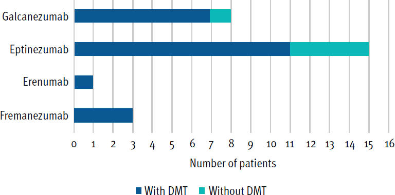 The cohort of 27 (88.9% female) with MS and either chronic (88.9%), episodic (7.4%), or unspecified (3.7%) migraine who received treatment with a CGRP monoclonal antibody (ie, fremanezumab, eptinezumab, erenumab, or galca-nezumab; FIGURE) had a mean age of 45.6 years. Of the participants, 82% were cotreated with a DMT for their MS (ie, ocrelizumab, glatiramer acetate, siponimod, cladribine, natalizumab, fingolimod, interferon beta-1a, alemtuzumab, dimethyl fumarate, or teriflunomide; see TABLE 1).