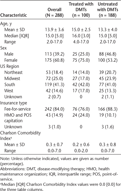 In the overall cohort (N = 288), the mean ± SD age of patients was 13.9 ± 3.6 years, and 175 (60.8%) of them were female (Table 2). Geographically, the population was representative across the US regions (Midwest, Northeast, South, and West). The mean ± SD Charlson Comorbidity Index score for the cohort was 0.3 ± 0.7. The proportion of females was higher in the treated group versus the untreated group (75.0% vs 53.2%). A comparatively higher proportion of DMT-treated patients had insurance coverage by health maintenance organization and point-of-service capitation insurance (24.0% [n = 24] vs 10.1% [n = 19]).