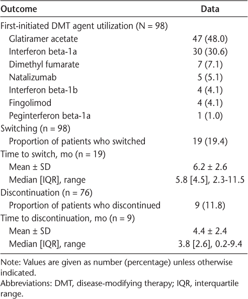 Most patients started with platform injectables (glatiramer acetate and interferon), and approximately one in three patients starting on their first disease-modifying therapy either discontinued or switched within 6 months of therapy initiation during follow-up.