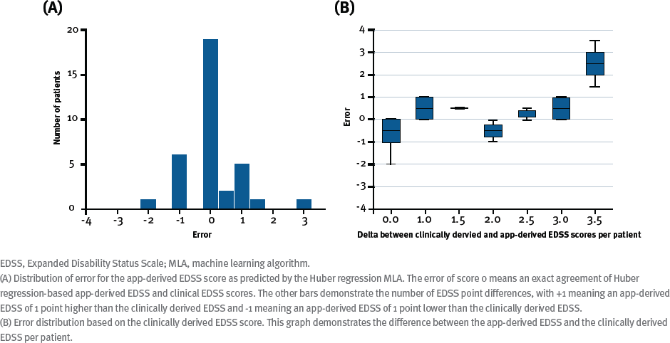 Our research compared EDSS scores derived from the BeCare MS link app to EDSS scores derived from neurologist assessment for the same cohort of 35 patients diagnosed with MS. App-derived data were supplied to 4 different machine learning algorithms (MLAs) with an independent EDSS score prediction generated from each. These scores were compared with the clinically derived EDSS score to assess the similarity of the scores and to determine an accuracy estimate for each.