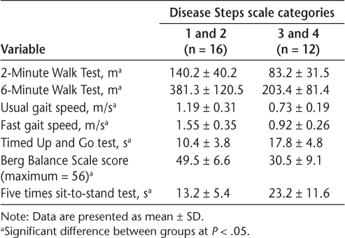 Twenty-eight ambulatory persons with MS aged 18 to 64 years participated in this cross-sectional study. Participants completed five measures of walking performance (2MWT, 6MWT, usual and fast gait speed, and Timed Up and Go test) and two functional measures (Berg Balance Scale and five-times sit-to-stand test) during a testing session. Participants were classified into two subgroups based on Disease Steps scale classification.
