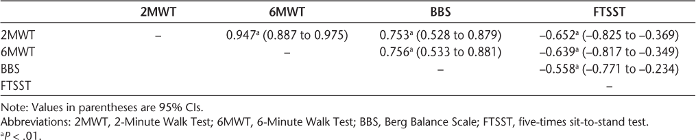 Table 3 presents the correlations among the 2MWT, the 6MWT, the BBS, and the FTSST. These associations were all significant at P < .01, although not as strong as the associations between the walk tests and the other gait measures. The magnitude of the associations of the 2MWT to the other gait and functional measures was similar to the magnitude of the 6MWT to the same measures.