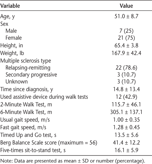 Twenty-eight persons with MS participated in this study and completed all the measurements. The sample consisted mostly of women (n = 21 [75%]) and those with relapsing-remitting MS (n = 22 [79%]) (Table 1). All the participants completed the 2MWT without a rest; seven persons with MS used at least one rest during the 6MWT. Two participants required one instance of contact guarding to prevent a fall during the 2MWT, and four required contact guarding during the 6MWT. No adverse responses were noted.