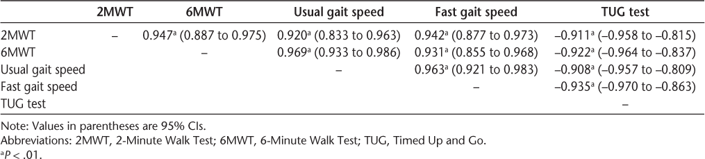 The 2MWT distance, the 6MWT distance, usual gait speed, fast gait speed, and TUG test time were strongly correlated (Table 2). The magnitude of the correlations for the 2MWT and the 6MWT with the other gait measures was similar. The mean (SD) gait speeds, 0.96 (0.38) m/s and 0.85 (0.38) m/s during the 2MWT and 6MWT, respectively, were comparable with usual gait speed (1.00 [0.35] m/s).