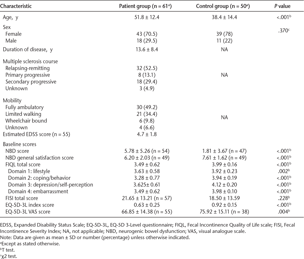 Patients with MS visiting the outpatient clinic of the Urology Department were asked to participate in this study, regardless of experiencing symptoms of fecal incontinence or constipation. The total NBD scores were low, although statistically significantly higher than those in the control group, indicating very minor overall bowel dysfunction in both the patient and control groups (0–6 points is very minor). It is known that NBD worsens as the disease progresses.8,19 Most participants in the patient group were in the relapsing-remitting course of the disease, in which symptoms, including bowel symptoms, can be absent or mild between exacerbations. A slightly positive correlation was found between total NBD scores and the estimated Expanded Disability Status Scale score; thus, higher Expanded Disability Status Scale scores indicate higher NBD scores (correlation coefficient = 0.18, P = .22).