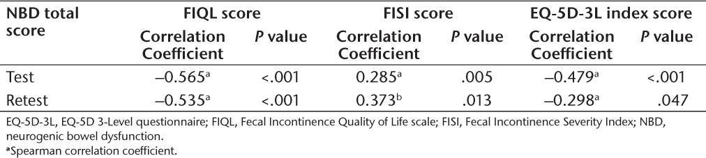If one or more questions were left unanswered, total NBD scores could not be calculated. This was the case for 6 patients, all but one of whom did not fill in the same questions at test and retest. Questions left unanswered were on digital evacuation of stool and frequency of fecal incontinence. Regarding the question on involuntary defecation, patients stated that an answer option of “never” was missing and for that reason left open. Internal consistency was determined to be moderate to low for the total NBD score. Cronbach α was 0.57 for the test and 0.41 for the retest.