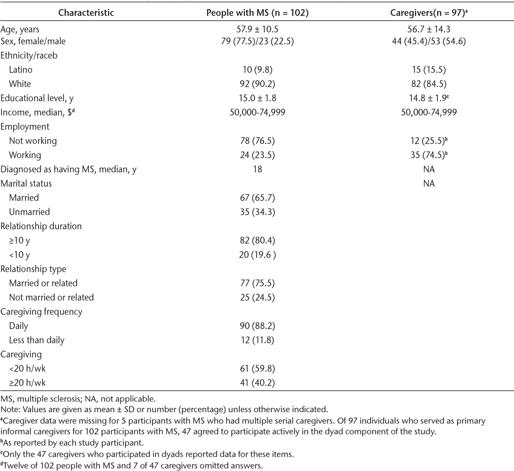 Table 2 describes the 102 participants with MS and 97 of their informal primary caregivers, 47 of whom opted to participate directly in the dyad component of the study. The typical study participant with MS resided in Orange County with a spouse or other relative as an unpaid primary caregiver, was unemployed yet had a relatively high median household income of $50,000 to $74,999 per year, and had been diagnosed as having MS for an average of 18 years. More than three-quarters of participants with MS were female.