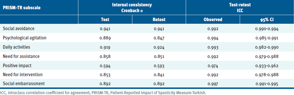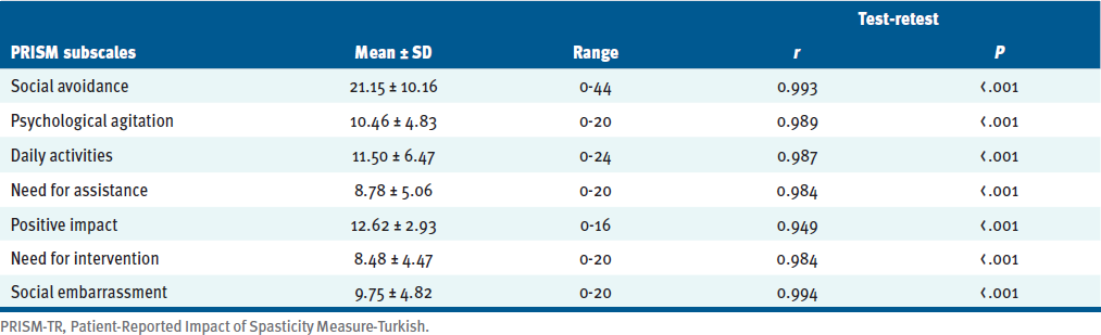 We aimed to evaluate the validity and reliability of the Turkish version of the Patient-Reported Impact of Spasticity Measure (PRISM-TR).