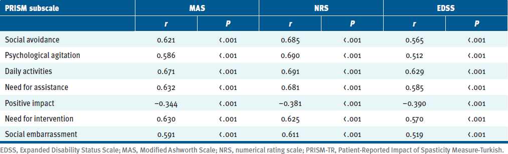 The construct validity of a scale can be assessed by examining its relationship with other validated instruments.18 For this purpose, PRISM-TR scores were compared with scores of the MAS, EDSS, and NRS, and significant moderate to strong correlations between the scales were observed (P < .001). The exception was the positive impact subscale, which showed weak correlations with other scales (TABLE S2).