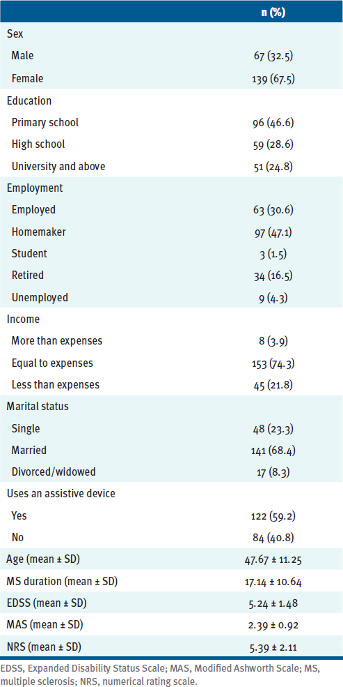 The mean age of the 206 patients interviewed was 47.7 ± 11.3 years. The majority were women (67.5%). Mean MS duration was 17.2 ± 10.6 years and mean EDSS score was 5.2 ± 1.5 Mean MAS score was 2.4 ± 0.9 and mean NRS score was 5.4 ± 2.1 (TABLE 1).