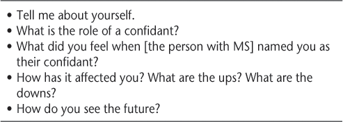 The individual in-depth interviews each lasted about 45 minutes. Twenty interviews were conducted with people with MS (13 with a confidant and 7 without). Separate individual interviews were conducted with the confidants (n = 13). All participants were interviewed in their own homes. A topic guide was used to enhance the narrative process. Initially participants were asked to relate their history from diagnosis, not only to provide some context for understanding the confidant relationship but also to give individuals the opportunity to relax and “tell their story.” Subsequent questions focused on the confidant relationship, specifically the definition of a confidant, reasons for choice of confidant if the person had one, and the reasons why the person felt psychologically and emotionally supported by the confidant. A topic guide was also used for the interviews of the confidants (Table 1). All interviews were audiotaped and transcribed verbatim. Personal names and locations were changed to protect participant identity.