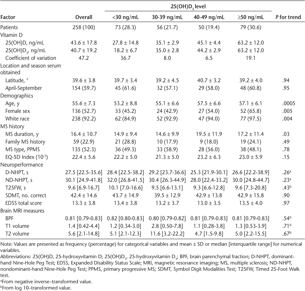 Of the 331 patients enrolled in the SPRINT-MS study, 258 (78%) had stored serum, OCT data, and clinical records from the screening visit available for analysis (Table 1). The cohort was equally represented by patients with PPMS (52.3%) and SPMS (47.7%). Most patients were White (93.5%), ranging in age from 31.8 to 65.9 (mean, 55.6) years. Mean ± SD vitamin D levels across all patients were 43.6 ± 17.8 ng/mL for 25(OH)D and 40.7 ± 19.2 ng/mL for 25(OH)D3. Both mean 25(OH)D (43.8 vs 42.9 ng/mL) and 25(OH) D3 (40.7 vs 39.9 ng/mL) levels were similar between patients with PPMS and SPMS (P = .47 and P = .31, respectively).