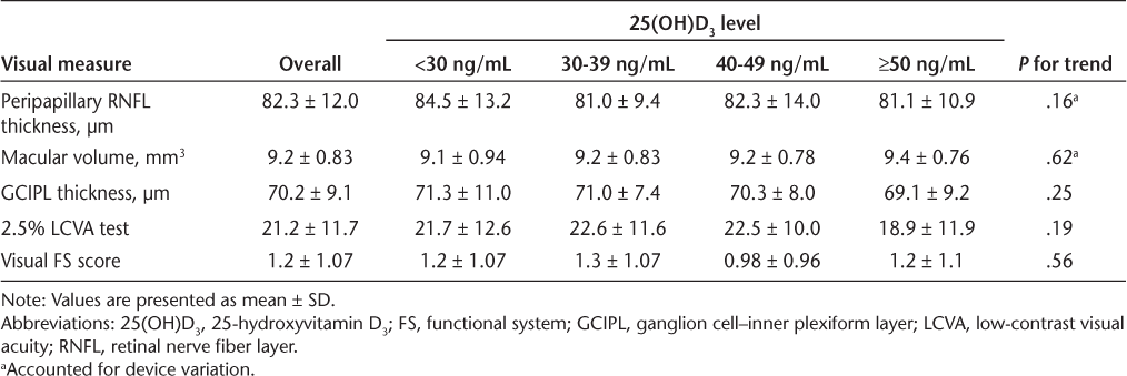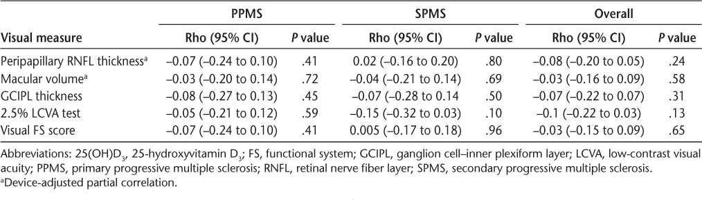 The analysis included 258 patients (mean ± SD age of 55.6 ± 7.3 years, 52.7% female, and 52.3% PPMS). Mean vitamin D values were above sufficiency and were similar between PPMS and SPMS (P = .47 and P = .31). There was no association between 25(OH)D3 levels and any visual markers, including peripapillary retinal nerve fiber layer thickness (Spearman r = −0.08), macular volume (r = −0.03), ganglion cell–inner plexiform layer (r = −0.07), and 2.5% low-contrast visual acuity test (r = −0.10). No statistically significant associations between vitamin D levels and visual system measurements were detected in the PPMS and SPMS subgroups.