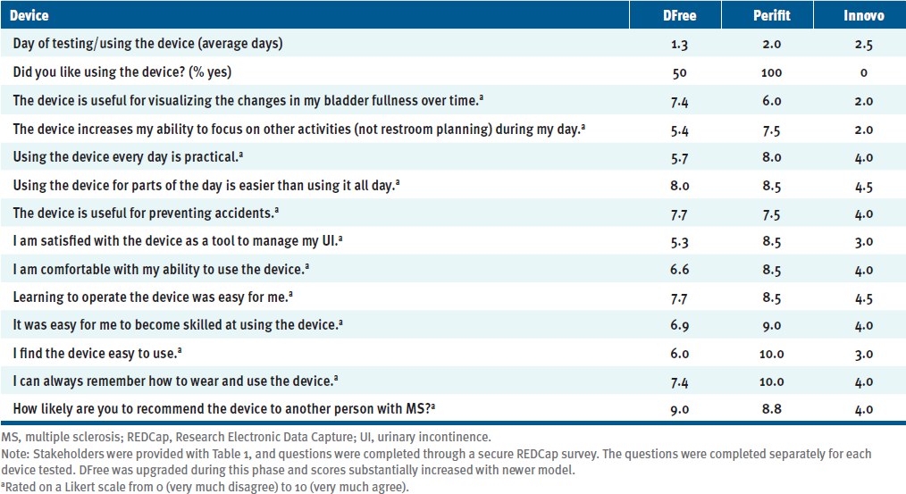 On a 10-point scale, the DFree, Perifit, and Innovo devices scored a 7 or above, were available in the United States for purchase at the time of the study, and were chosen for testing by stakeholders (full details in TABLE S2). The Carin Pro was not in stock at the time of the study. Notably, although the Uromonitor, eCoin, and BlueWind RENOVA (since renamed Revi) were thought to be promising, they were still under investigation and not available for commercial use at the time of the study.