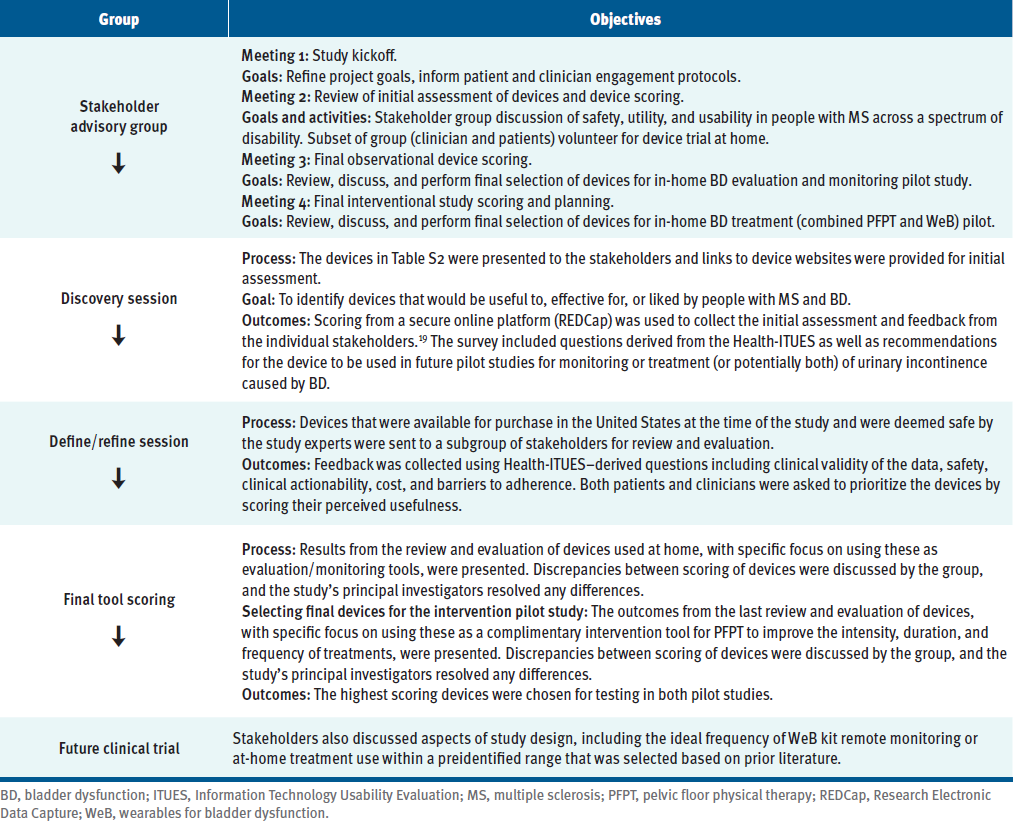 The clinicians were a neuro-urologist (AMS), an MS neurologist (RB), a pelvic floor physical therapist (LM), an MS remote monitoring expert and physical therapist (VJB), and an international women’s health expert (Doreen McClurg, PhD). The patients were 3 women and 1 man with MS who had varying degrees of BD (all with documented bladder-related issues in their electronic medical records). They had different levels of technical literacy and were aged between 36 and 68 years.