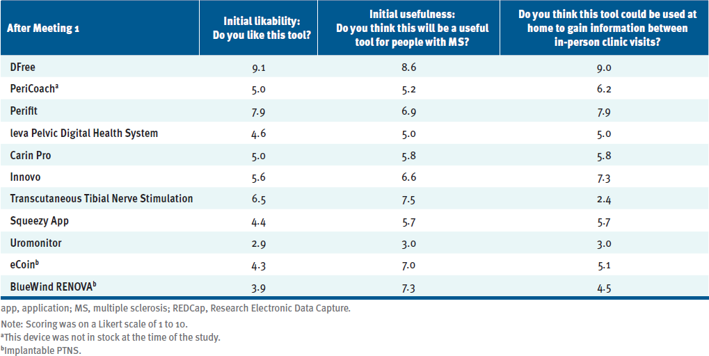 Four people with MS with varying BD severity, and 5 MS clinical/research experts had 4 virtual meetings. Commercially available bladder tools were graded for ability to evaluate, monitor, or treat BD. The Health Information Technology Usability Evaluation Scale (utility, usability, feasibility) was used for evaluation. Scoring was performed individually and as a group.