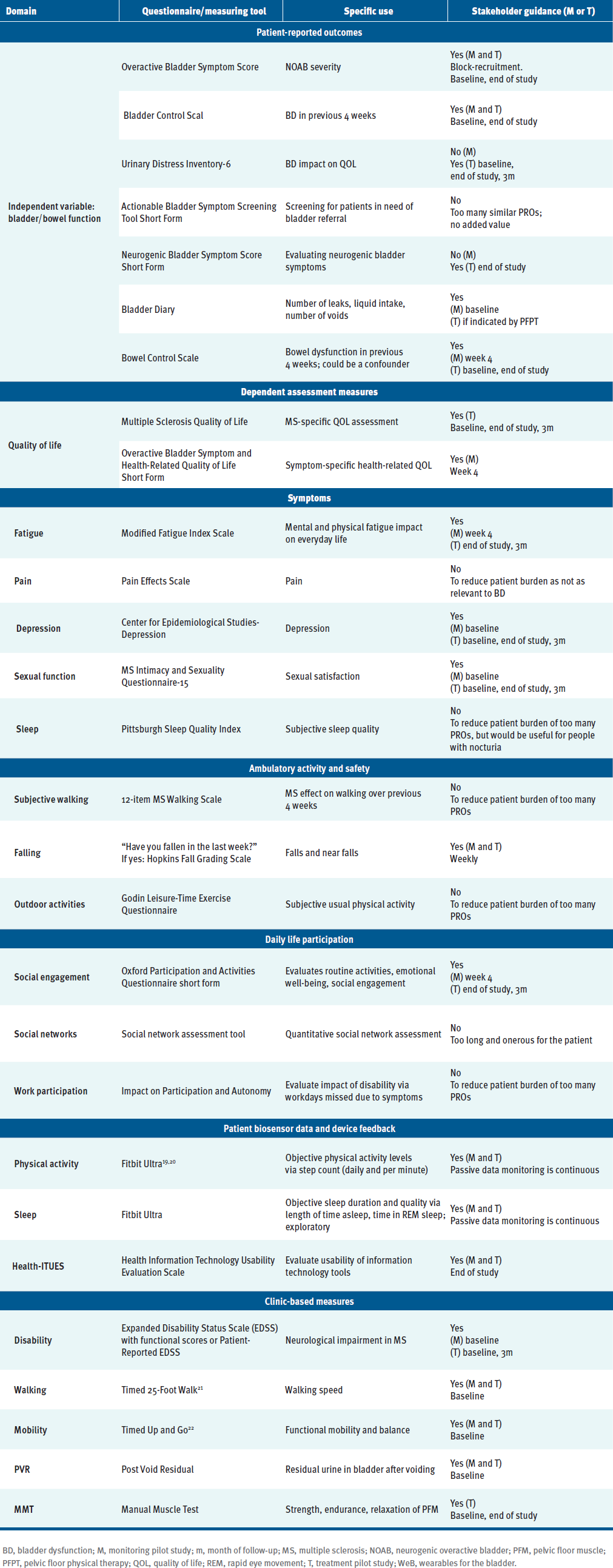 This process underscores the critical role of stakeholder engagement in the selection of digital tools, especially in sensitive domains like pelvic function. Ongoing clinical validation of the selected tools will yield a validated, user-friendly WeB kit that is able to fill gaps in our ability to evaluate BD treatments in people with MS, ultimately reducing the impact of BD on quality of life.