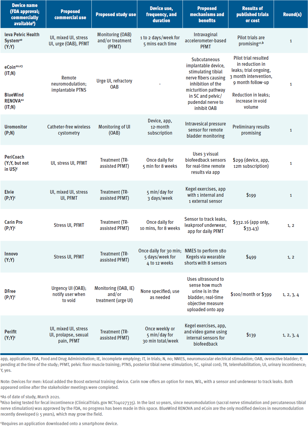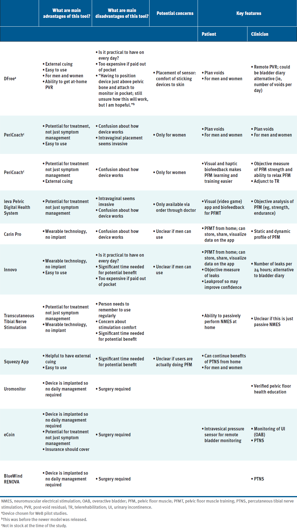 Of the 11 devices, 5 obtained mean scores of greater than 6 of 10 for likability, usability, and device utility. The 2 highest scoring (9/10) devices were selected for the pilot. One device measures bladder urine levels, reporting the number/frequency of voids/leaks; the other guides pelvic floor exercises by pairing games on an app with biofeedback from intravaginal sensors. We uncovered critical differences in experts’ and patients’ appreciation of the tools, and the collaborative engagement led to substantial revisions of initial tool scores.